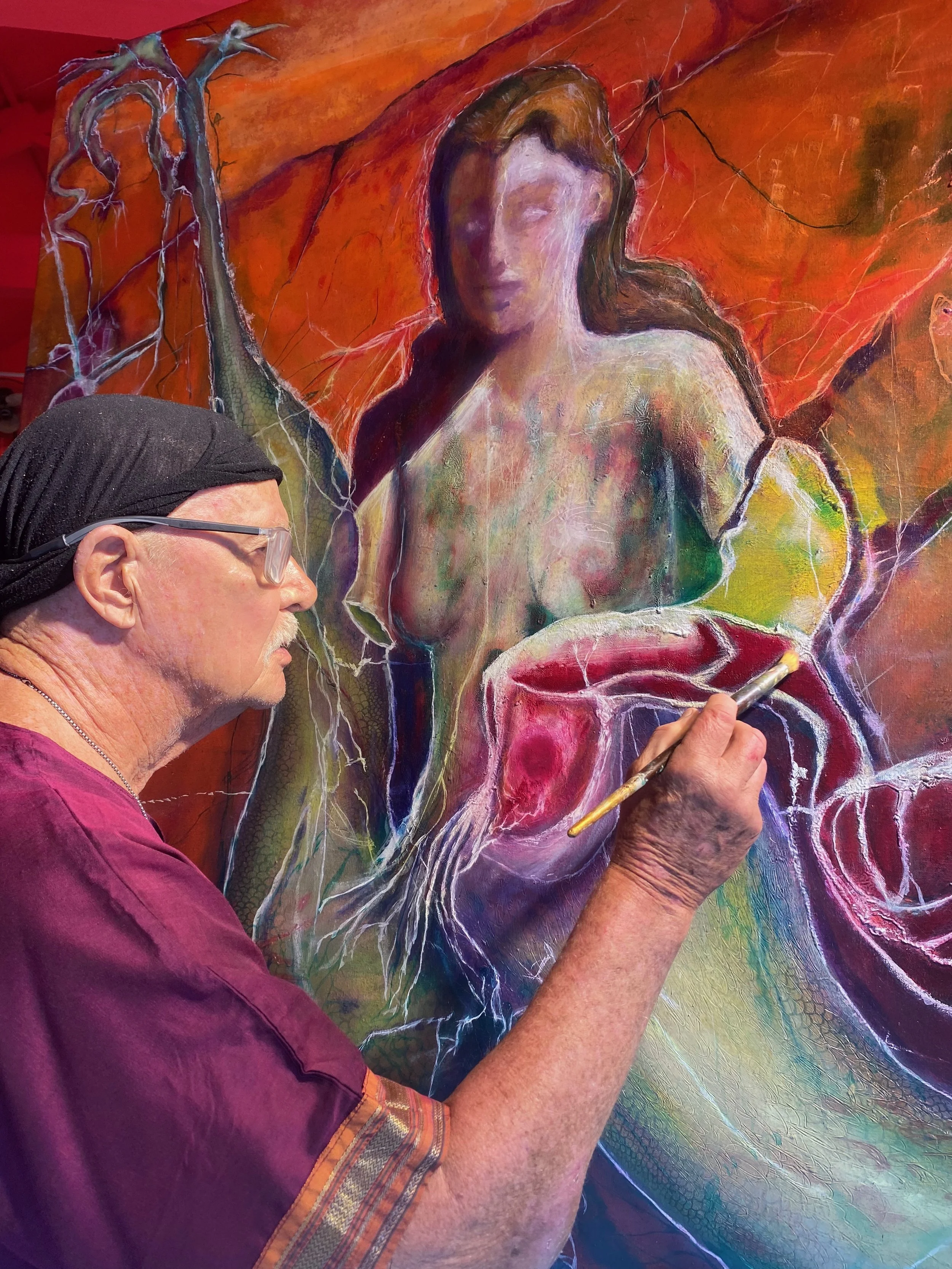 This major painting ‘The Elephant and The Mermaid’ having been damaged by climate and insects, has been restored, reclaimed, and transformed by Bruce several times. Currently on show again at The Gallery of Tropical Surrealism, Bali.